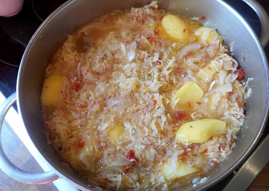 In einem Topf die Zwiebeln mit Zucker und Butterschmalz anrösten, mit Essig, Wein und etwas Wasser aufgießen. Kraut, Kartoffeln, Tomaten und Speck mit den Gewürzen beigeben und zugedeckt dünsten lassen. (Falls zu wenig Flüssigkeit ist, eventuell noch etwas Suppe oder Wasser nachgießen.)