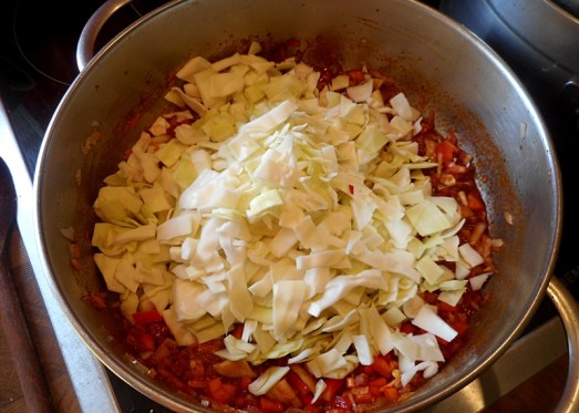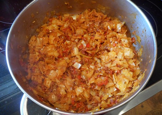 Zwiebel und Knoblauch mit den Speckwürfeln und dem Zucker leicht anrösten. Jetzt kommen das Paprikapulver und das Tomatenmark dazu, kurz mitrösten und rasch mit ein wenig Wasser ablöschen. Die Paprikastücke und das geschnittene Kraut dazugeben. Mit Majoran, Kümmel, Salz und Pfeffer würzen.