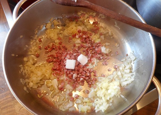 Zwiebel und Knoblauch mit den Speckwürfeln und dem Zucker leicht anrösten.