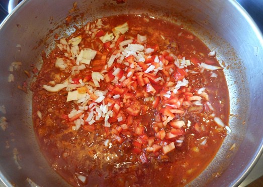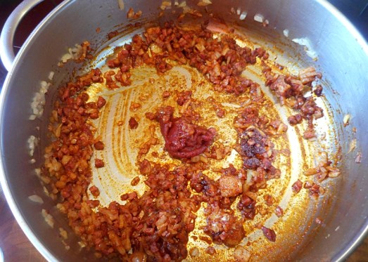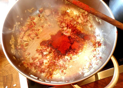 Jetzt kommen das Paprikapulver und das Tomatenmark dazu.