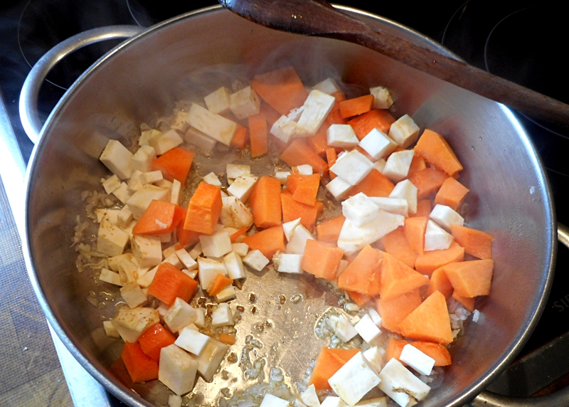 Die klein geschnittene Zwiebel und den Knoblauch in Butterschmalz glasig anrösten, die groben Kürbis- und Selleriewürfel dazugeben, durchmischen, kurz mitrösten und mit Suppe aufgießen. (Als schnelle Lösung eignen sich auch in heißem Wasser aufgelöste Suppenwürfel.) Würzen und zugedeckt dünsten, bis das Gemüse* weich ist.