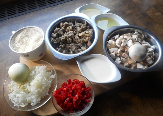 Zutaten: Einen Becher Reis, 400 g Fleisch (Schwein oder Rind), 500 g Champignons, eine rote Paprikaschote, eine Zwiebel, 1/4 l Obers, 1/8 l Weißwein, etwas Öl, 1 EL Mehl, Salz, Pfeffer, Wasser