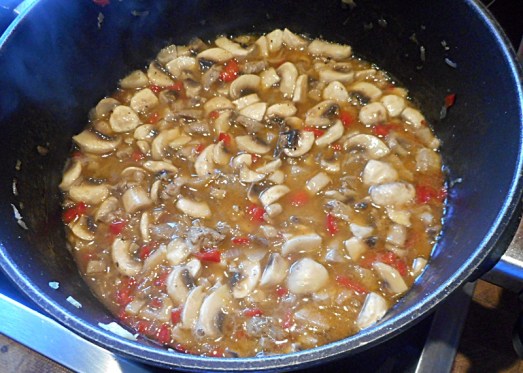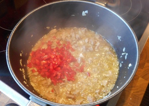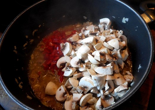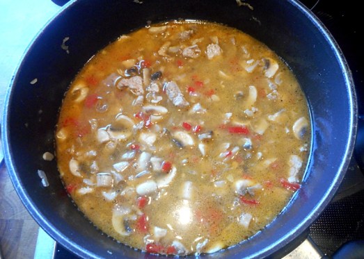 Die gewürfelten Paprikaschoten und die blättrig geschnittenen Champignons zum Fleisch geben und alles kurz aufkochen.