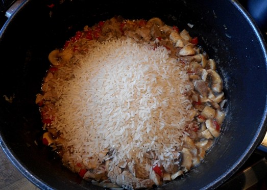 Nun einen Becher Reis unter das gedünstete Fleisch mischen. Mit zwei Bechern Flüssigkeit (Wasser oder Suppe) aufgießen und zugedeckt weichdünsten.