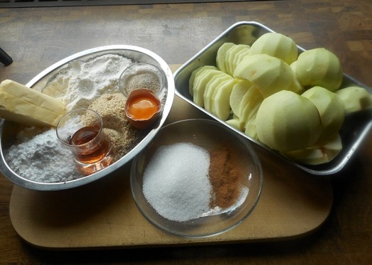 Zutaten für den Mürbteig: 250 g Mehl, 50 g Nüsse, 120 g Butter, 60 g Zucker, 2 Eidotter, Vanille, Spritzer Rum, Prise Salz | Für die Fülle: Äpfel, Zimt, Zucker, Marillenmarmelade, Zitronensaft | Für die Schneehaube: 2-3 Eiklar, 2-3 EL Zucker, Spritzer Zitronensaft