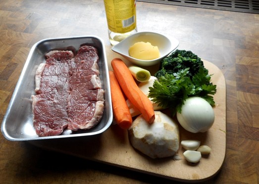 Zutaten: zwei Stück Rostbraten, Karotten, Petersilie, Lauch, Blattspinat (frisch oder tiefgekühlt), Zwiebel, Knoblauch, Öl, Butter, Salz, Pfeffer, Muskat, Worcestersauce, event. etwas Wein