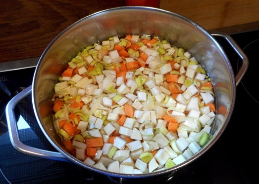 Die Zwiebel fein und das restliche Gemüse kleinwürfelig schneiden.