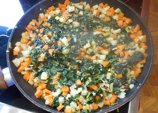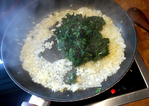 In der Pfanne mit den Bratrückständen die Zwiebel und den Spinat anrösten.