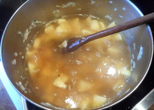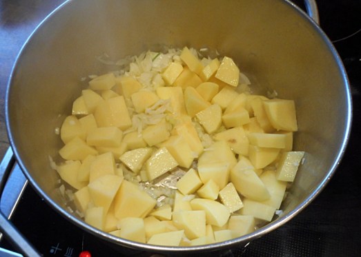 Zwiebel und Knoblauch in ein wenig Butterschmalz anschwitzen, Kartoffeln dazugeben, kurz mitrösten lassen und mit Suppe aufgießen. (Oder mit Wasser aufgießen und mit Suppenwürfeln verfeinern).