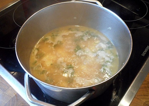 … mit Suppe aufgießen. (Oder mit Wasser aufgießen und mit Suppenwürfeln verfeinern).