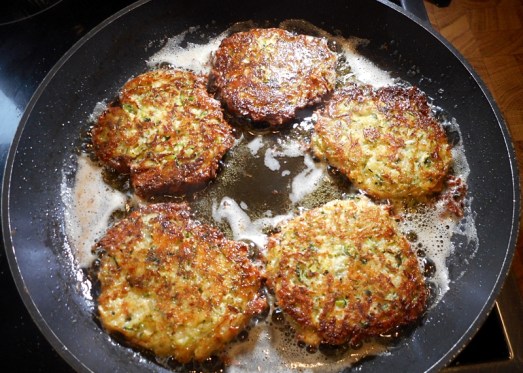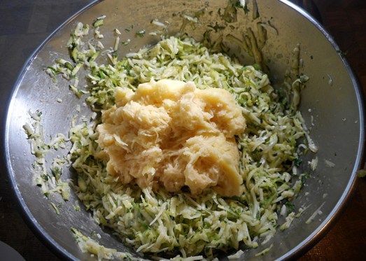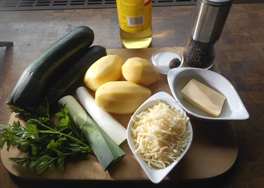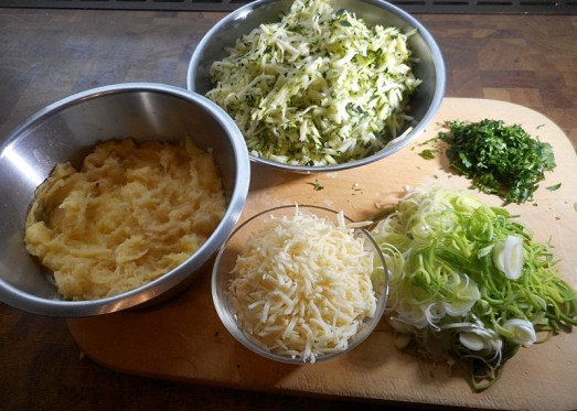 Zutaten: 3 Zucchini, 2 – 3 Kartoffeln, 1 Lauch, 2 Eier, 150 g Käse (zB Emmentaler), etwas Butter, Petersilie, Salz, Pfeffer, Muskat, Öl zum Herausbacken
