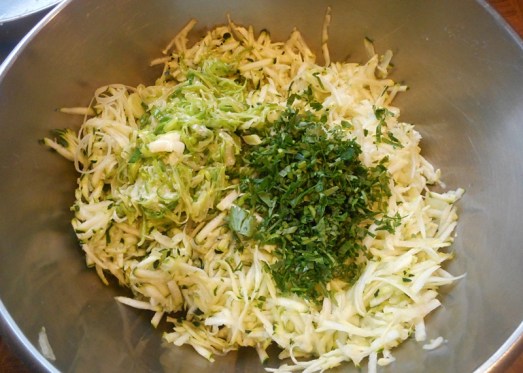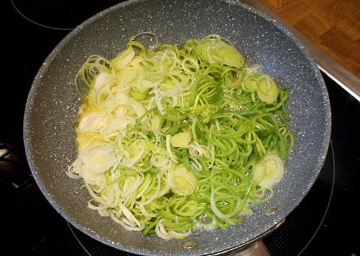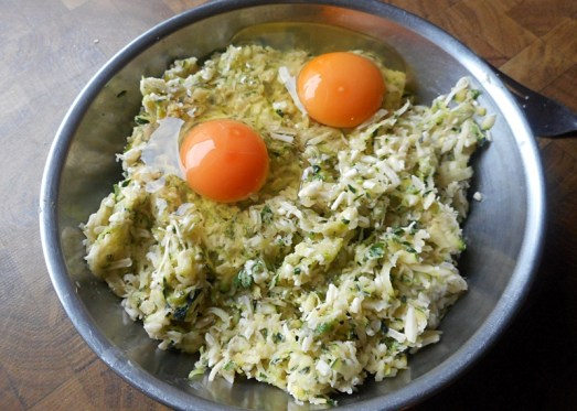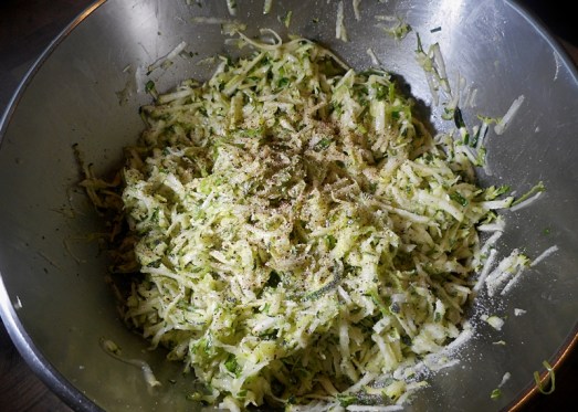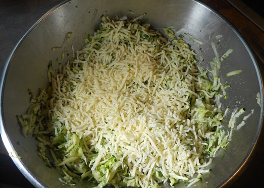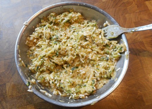 Den Lauch in ein wenig Butter anschwitzen und mit der geriebenen Zucchini und der Petersilie vermischen. Würzen und den Käse untermischen.