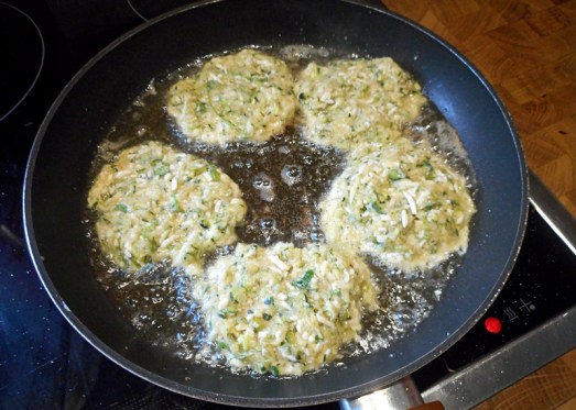 Aus der Masse kleine Portionen formen und in der Pfanne flachdrücken, in heißem Öl beidseitig herausbacken.