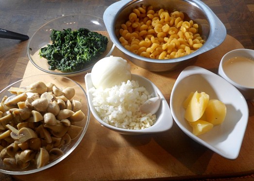 Zutaten: 250 g Blattspinat (tiefgekühlt oder frisch), 250 g Champignons, 250 g Nudeln, 1/8 l Obers, 30 g Butterschmalz oder Öl, 1 Zwiebel, 2 Knoblauchzehen, Salz, Pfeffer, Muskat