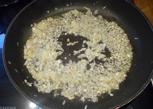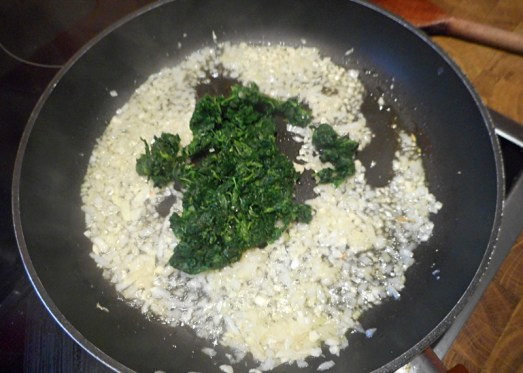 Die Nudeln kochen und den Spinat vorbereiten. (Tiefgekühlten auftauen lassen, frischen Spinat in gesalzenem Wasser kurz blanchieren und abschrecken, jeweils das Wasser ausdrücken.) Zwiebel und Knoblauch fein schneiden und glasig anschwitzen.