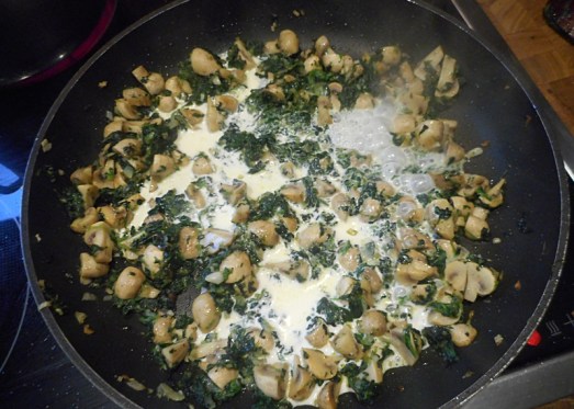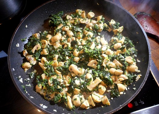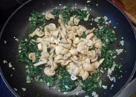 Zwiebel und Knoblauch fein schneiden und glasig anschwitzen. Spinat mit den Champignons dazugeben und ein wenig anrösten.