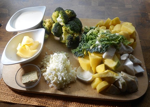 Zutaten: Brokkoli, Wurzelgemüse (Karotten, Sellerie, Petersilie, Kartoffeln … was sich im Kühlschrank findet), 1 Zwiebel, 2 Knoblauchzehen, 80 g Butterschmalz (oder Öl), 1/4 l Obers, Salz, Pfeffer, Muskat, 1 l Suppe (Fond oder Suppenwürfel)
