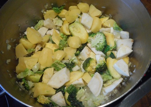 Das trockene Strunkende und holzige Stellen wegschneiden. Den Brokkoli-Strunk dann wie das Wurzelgemüse und die geschälten Kartoffeln grobwürfelig schneiden. (Die Kartoffeln geben der Suppe die Bindung.)