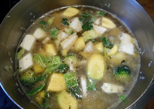 Die Zwiebel und den Knoblauch kleinschneiden und in einem Topf mit Butterschmalz (oder Öl) glasig rösten. Die Gemüsewürfel dazugeben, etwas durchrösten lassen. Mit der Suppe aufgießen, würzen und 20 Minuten zugedeckt köcheln lassen.