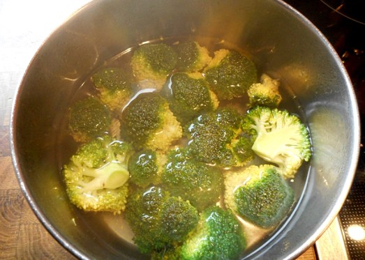 In der Zwischenzeit die Brokkoliröschen einige Minuten in leicht gesalzenem Wasser köcheln lassen.