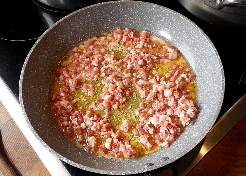 Tomaten kreuzweise einschneiden, kurz ins kochende Wasser legen, herausnehmen, mit kaltem Wasser abschrecken und schälen. Tomaten halbieren und (zB mit einem Löffel) die Kerne entfernen. Das Fruchtfleisch in kleine Würfel schneiden. Die fein geschnittene Zwiebel und die Speckwürferl …