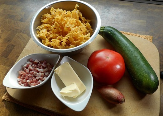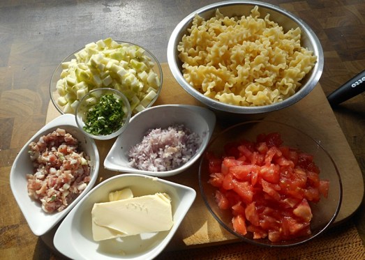 Zutaten: Nudeln, 1 bis 2 Tomaten, 1 Zucchini, 1 Zwiebel, 1 EL Butter, Petersilie, 50 g Speck (optional), Salz, Pfeffer