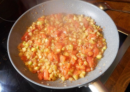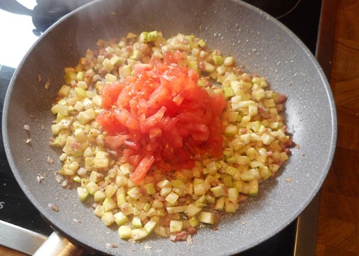 Die Zwiebel in Butter anrösten. Speck und Zucchini dazugeben und mitrösten lassen. Dann kommen auch die Tomaten und die Petersilie in die Pfanne. Mit Salz und Pfeffer würzen.