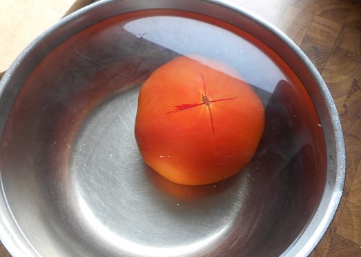 Tomaten kreuzweise einschneiden, kurz ins kochende Wasser legen, herausnehmen …