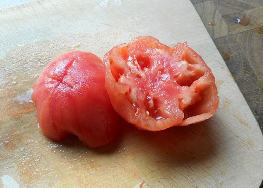 Tomaten halbieren und (zB mit einem Löffel) die Kerne entfernen. Das Fruchtfleisch in kleine Würfel schneiden.