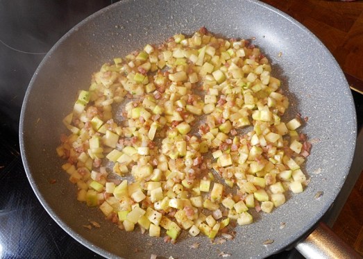 Speck und Zucchini dazugeben und mitrösten lassen.
