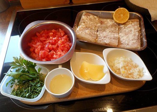 Zutaten: 2 Tomaten, 1 Zwiebel, 2 Knoblauchzehen, Petersilie, 30 g Butterschmalz, 6 Stück Seefisch, Salz, Pfeffer, Öl, 50 g Butter, Zitronensaft