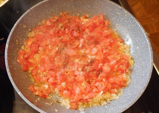 Zwiebel und Knoblauch in Butterschmalz (oder Öl) glasig anrösten, die Tomaten dazugeben und noch einige Minute rösten lassen. Mit Salz, Pfeffer abschmecken und mit Petersilie verfeinern.