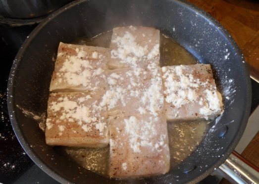 Den Fisch salzen, pfeffern, mit Zitronensaft beträufeln und mehlieren.