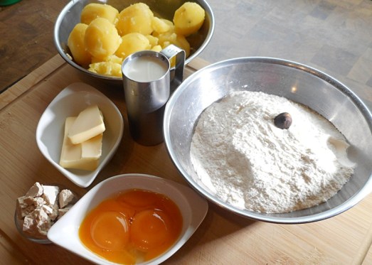 Zutaten für den Teig: 1/2 kg Kartoffeln, 30 g Germ (Hefe), 4 EL Milch, 20 g Butter, 2 Dotter, 350 g Mehl, Salz, Muskat