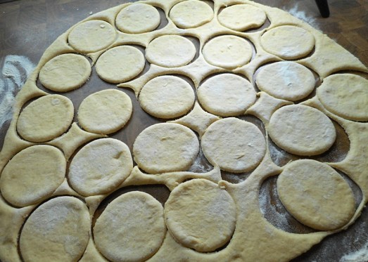 Die Kartoffeln kochen und passieren. Den Germ in der Milch auflösen und mit den restlichen Zutaten zu einem festen Teig verkneten.