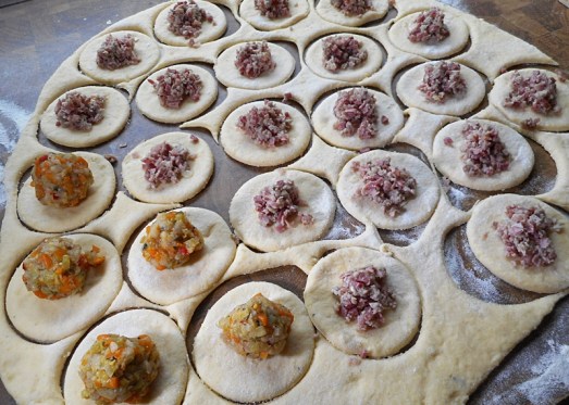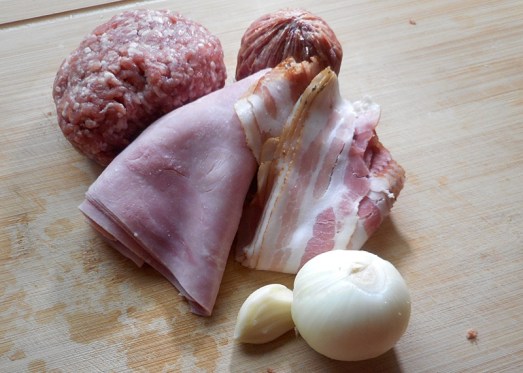 Zutaten für die Fülle: 200 g Fleischhaschee, 250 g Wurst, Speck und Schinkenreste | Für die vegetarische Variante: Gemüse nach Belieben!