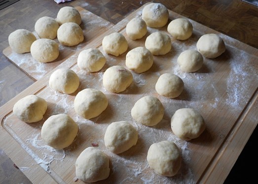 Kleine Knödel formen und diese zum Aufgehen zugedeckt an einen warmen Ort stellen.