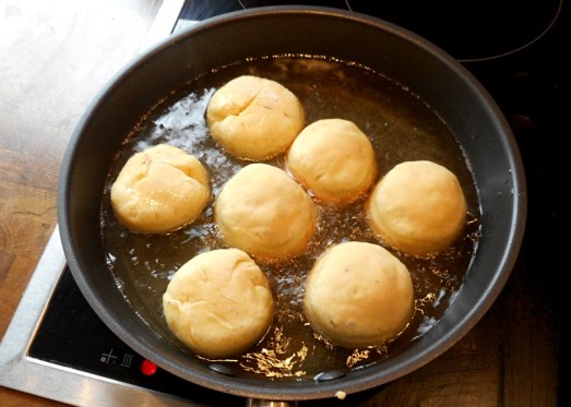 Wenn sie aufgegangen sind, werden die Knödel im heißen Fett oder Öl herausgebacken.