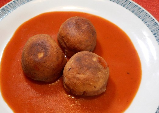 Tipp 1: Alternativ kann man die Knödel auch in Salzwasser kochen. Zugedeckt ca. 6 Minuten langsam kochen, wenden und noch weiter 5 bis 8 Minuten ziehen lassen. | Tipp 2: Die Knödel schmecken auch als süße Variante, also mit Früchten oder Marmelade gefüllt. Halt ohne Tomatensauce. 😉