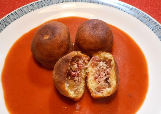 Zutaten für den Teig: 1/2 kg Kartoffeln, 30 g Germ (Hefe), 4 EL Milch, 20 g Butter, 2 Dotter, 350 g Mehl, Salz, Muskat | Zutaten für die Fülle: 200 g Fleischhaschee, 250 g Wurst, Speck und Schinkenreste | Für die vegetarische Variante: Gemüse nach Belieben! | Zutaten und Zubereitung für Sauce: Tomatensauce
