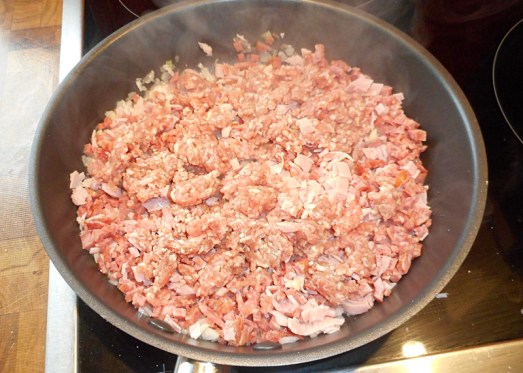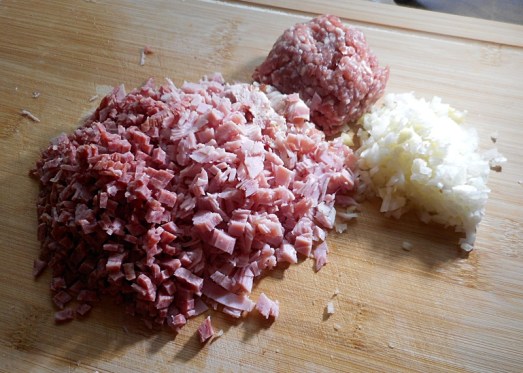 In der Zwischenzeit die Fülle vorbereiten. Dazu die Wurst- und Speckreste kleinwürfelig und Zwiebel und Knoblauch fein schneiden. Zwiebel und Knoblauch anrösten, Faschiertes und die Wurst- und Speckwürferl untermischen und mitrösten lassen.