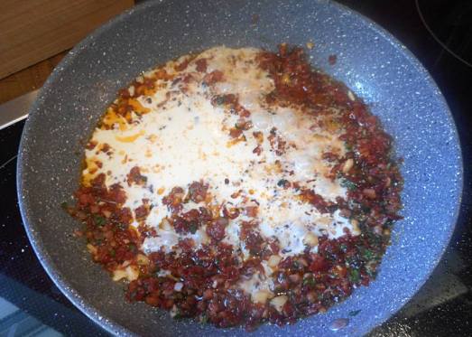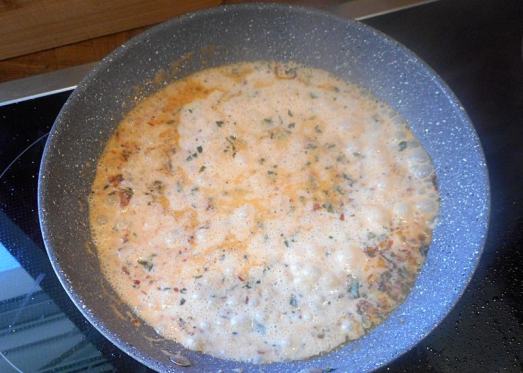 Speck, Knoblauch, Tomaten und Petersilie klein würfeln bzw. fein hacken und vermischen. Die Mischung in heißer Butter anschwitzen. Mit Wein ablöschen und mit Obers verfeinern. Einige Minuten köcheln lassen.