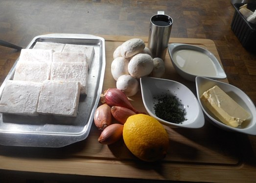 Zutaten: Seefisch, Champignons, Schalotten, Dill, 1/4 l Obers, 1/8 l Weißwein, Zitronensaft, Salz und Pfeffer