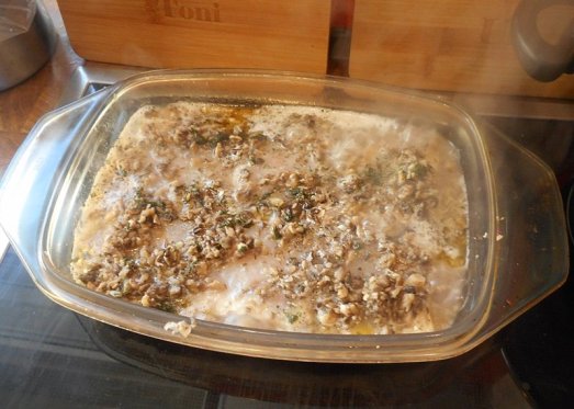 Die Champignons, den Rest Weißwein, ein wenig Wasser zum Fisch geben. Die Auflaufform mit Folie abdecken. Im Rohr (oder auf der Herdplatte) fünfzehn Minuten dünsten lassen.