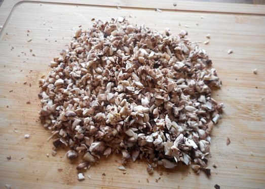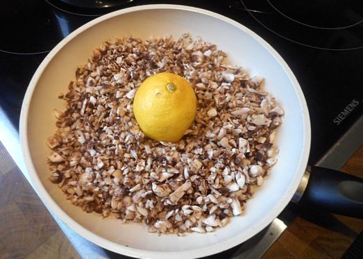Die Champignons hacken und in etwas zerlassener Butter (oder Öl) und unter Beigabe von einem Spritzer Zitronensaft anschwitzen. Mit ein wenig Weißwein aufgießen und kurz dünsten lassen. Mit Salz und Pfeffer würzen.