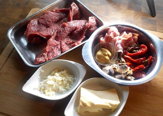 Zutaten: Rostbraten, Champignons, Kapern, Sardellen, Speck, Senf, getrocknete Tomate, 1/16 l Weißwein (halbes Achterl), l/4 l Obers, Öl, 1 EL Butter, 1 kleine Zwiebel, ein wenig Wasser, Salz, Pfeffer