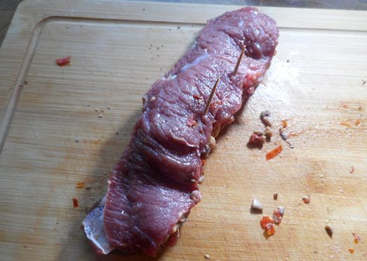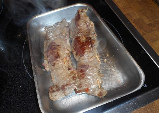 Die Rostbraten mit Zahnstochern verschließen. Nur vorsichtig salzen, da die Fülle sehr würzig ist.