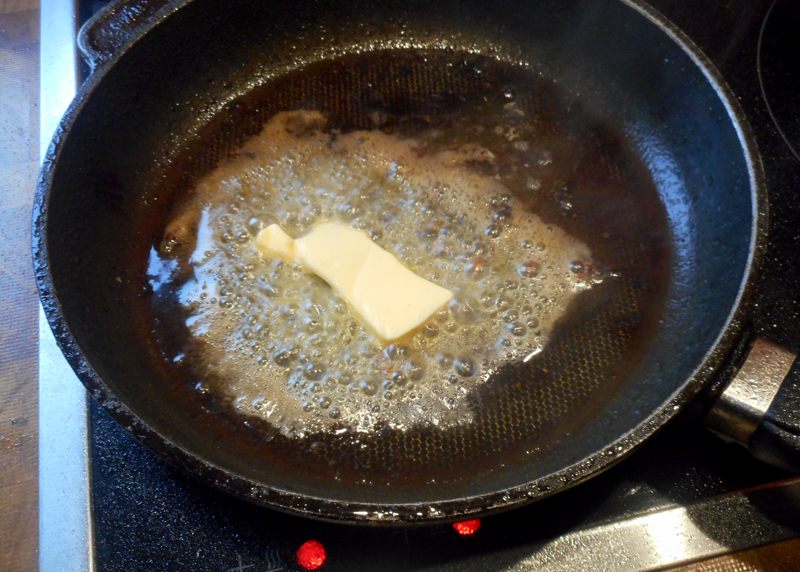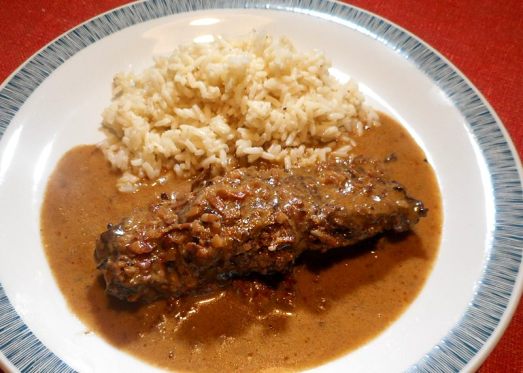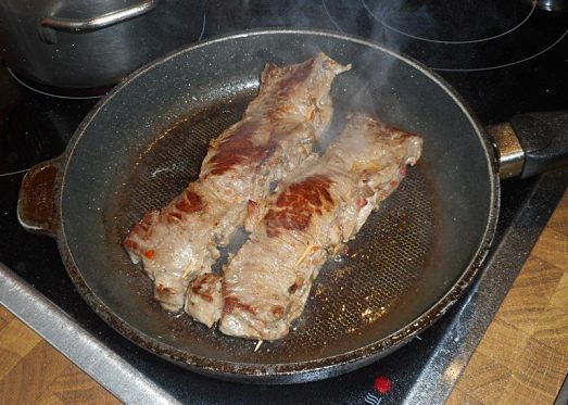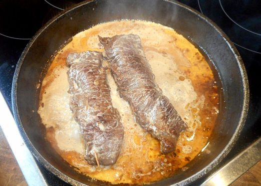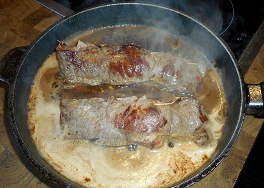 Jetzt kommen die Rostbraten wieder in die Pfanne. Zugedeckt zwanzig Minuten dünsten lassen. Wenn die Rostbraten weich sind, Obers dazugeben und noch einmal kurz aufkochen.