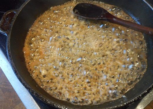 In wenig Öl beidseitig anbraten, dann die Rostbraten aus der Pfanne nehmen und zur Seite stellen. In die benutzte Pfanne Butter geben, die klein geschnittene Zwiebel dazugeben, kurz rösten lassen. Mit Wein und Wasser ablöschen.