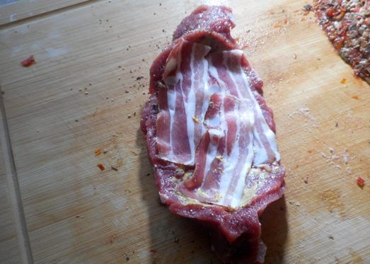 In die Rostbraten seitlich eine Tasche einschneiden, aufklappen und mit Senf bestreichen. Dann mit Speck belegen und auf dem Speck die Fülle verteilen.